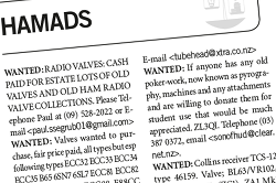 A single, free Hamad in each issue of Break-In is only available to financial members and Branches of NZART buying or selling personal equipment. Members and Branches wishing to use this service must include their NZART Membership Number or other evidence of membership.
